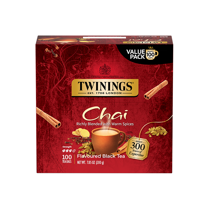 A box of 50 Chai Flavoured Black Tea, by Twinings London.